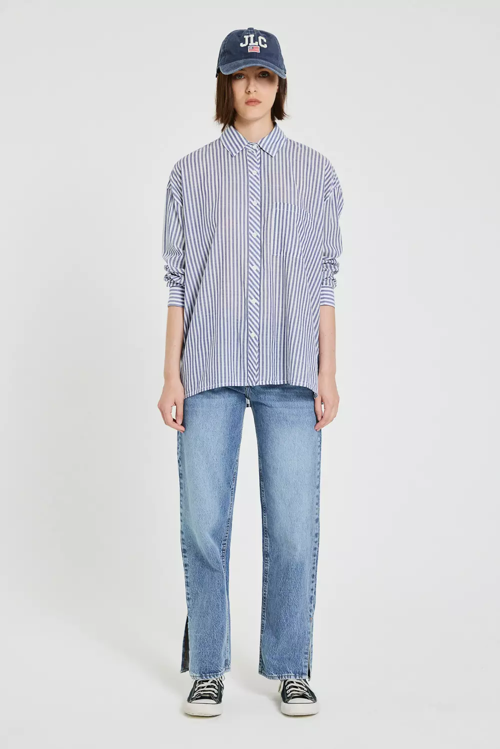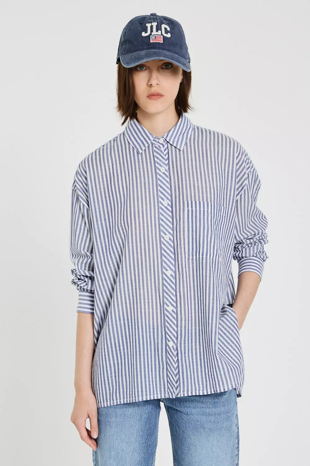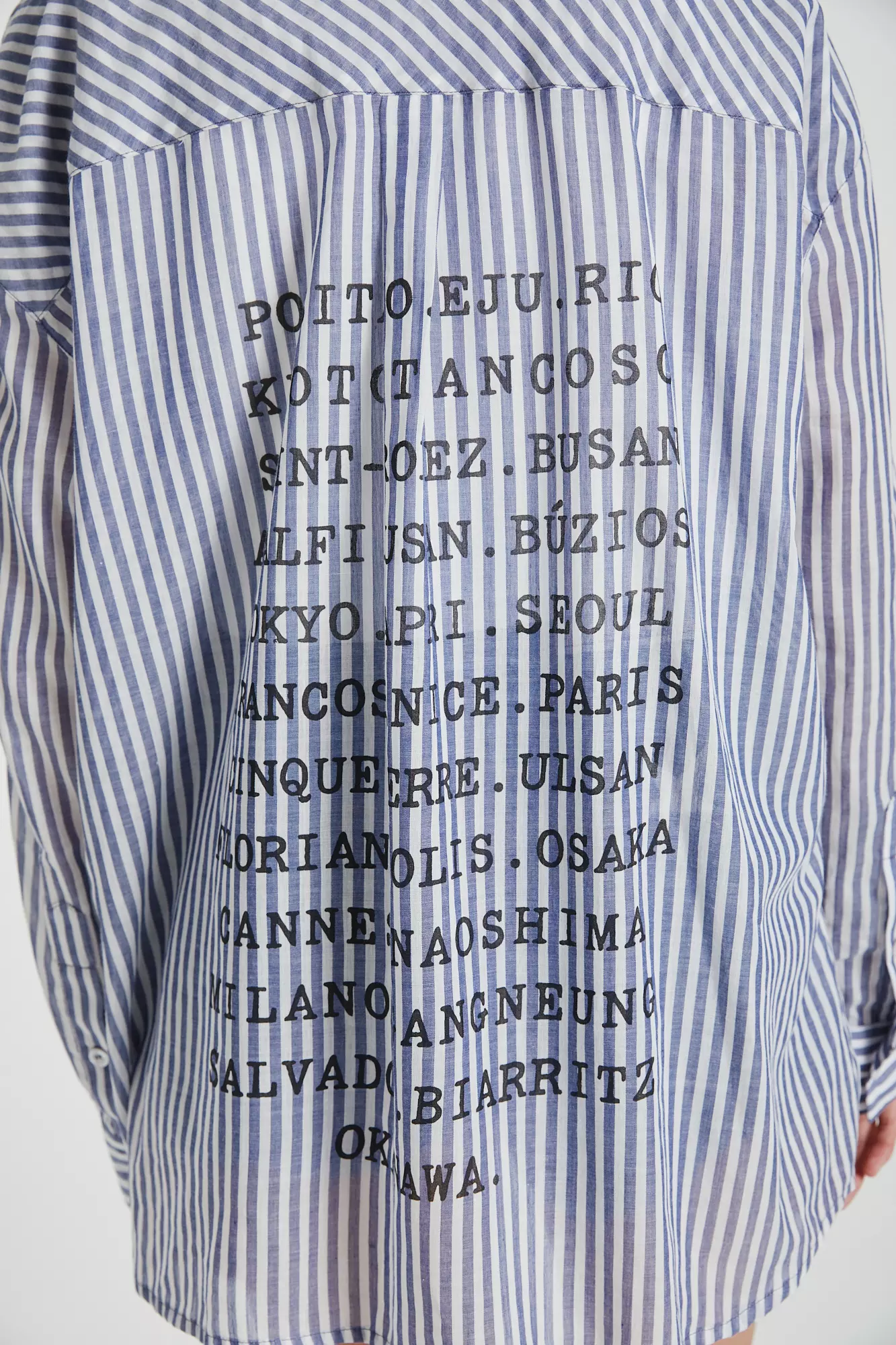 Camisa mangas largas oversize, rayada celeste y blanco, con bolsillos en delantero y estampa en espalda.