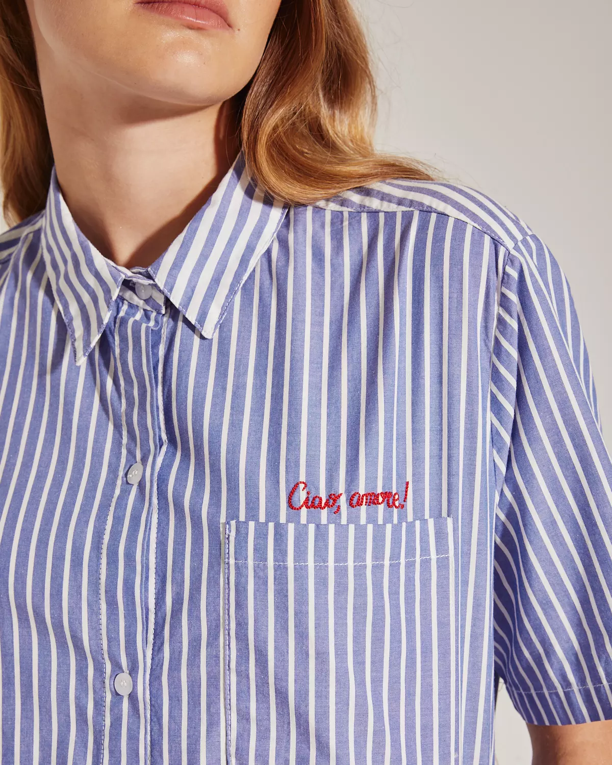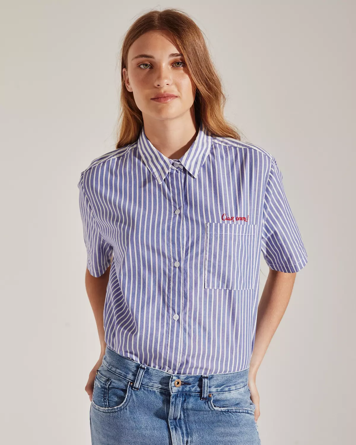 Camisa confeccionado en tejido plano rayado con combinación de rayas. Calce amplio y mangas cortas. Detalle de bordado en bolsillo delantero y espalda.