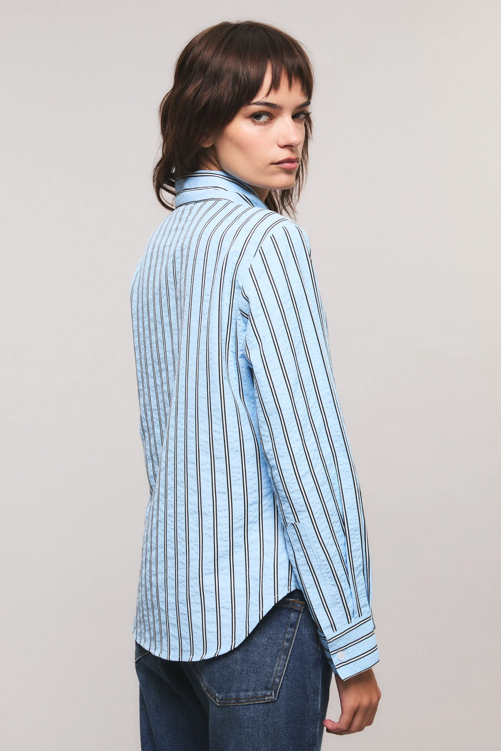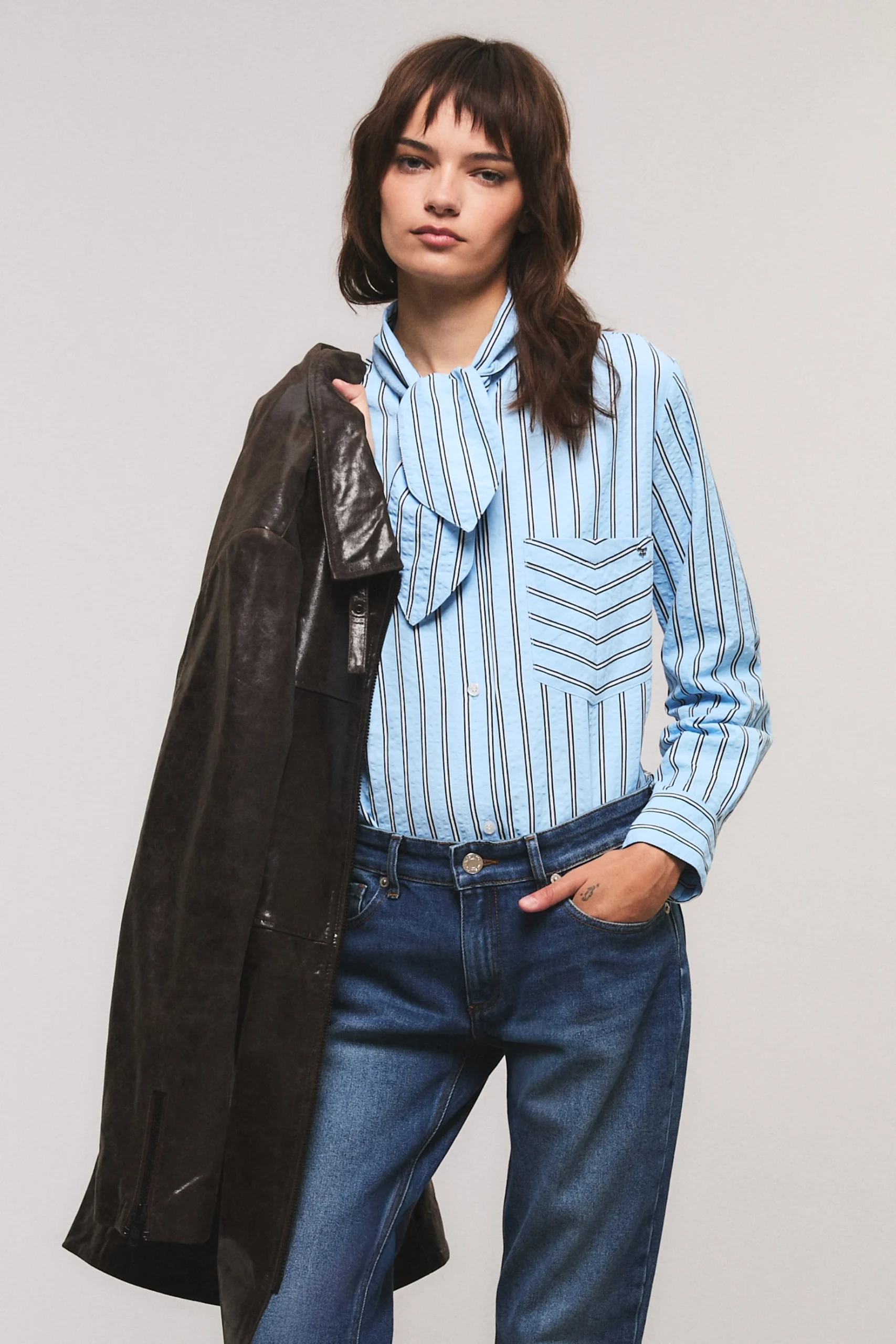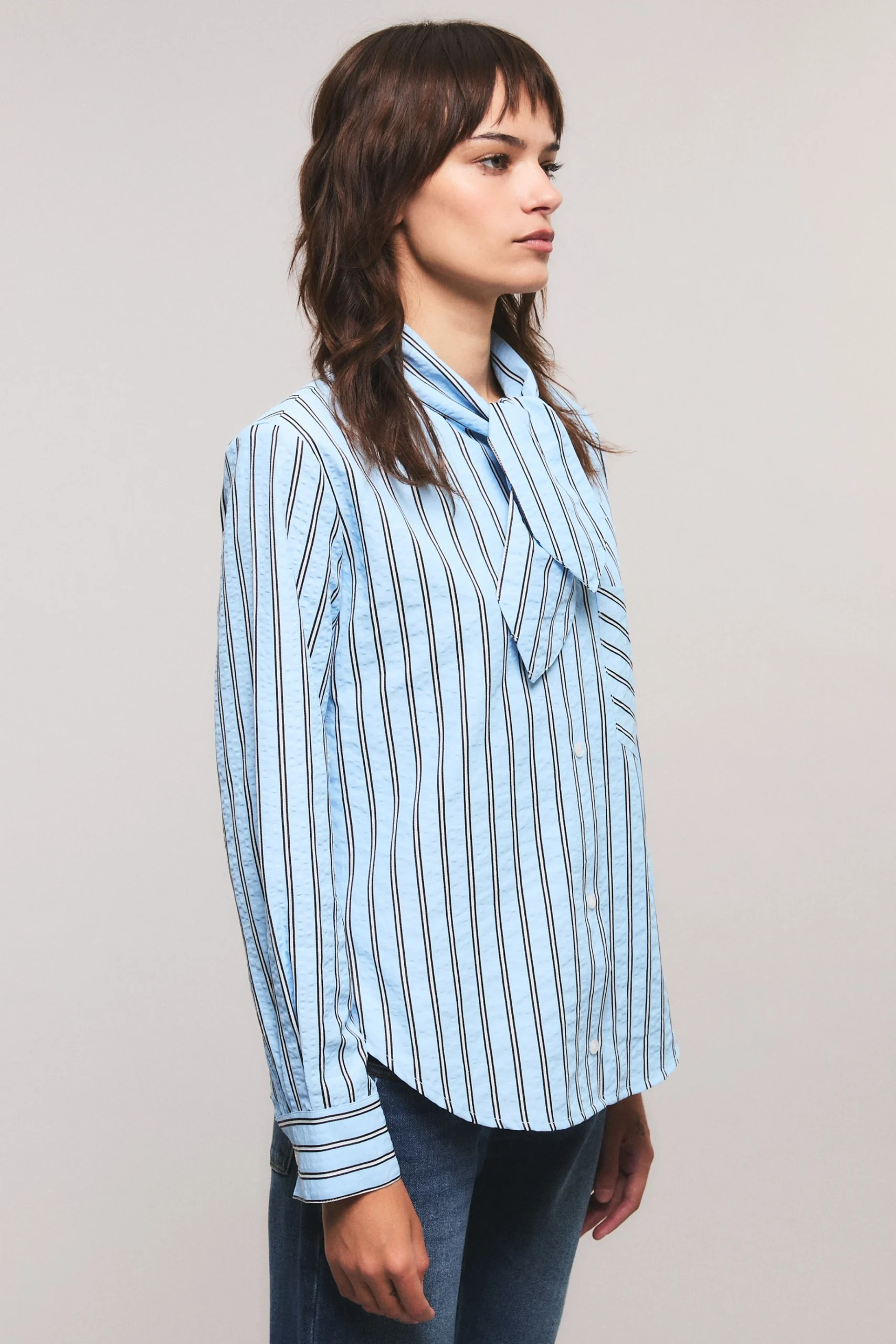La camisa Stripes presenta un calce slim. Cuenta con un lazo corto en su escote que permite ser anudado. Tiene un bolsillo delantero en el lado izquierdo con un avio marcario.