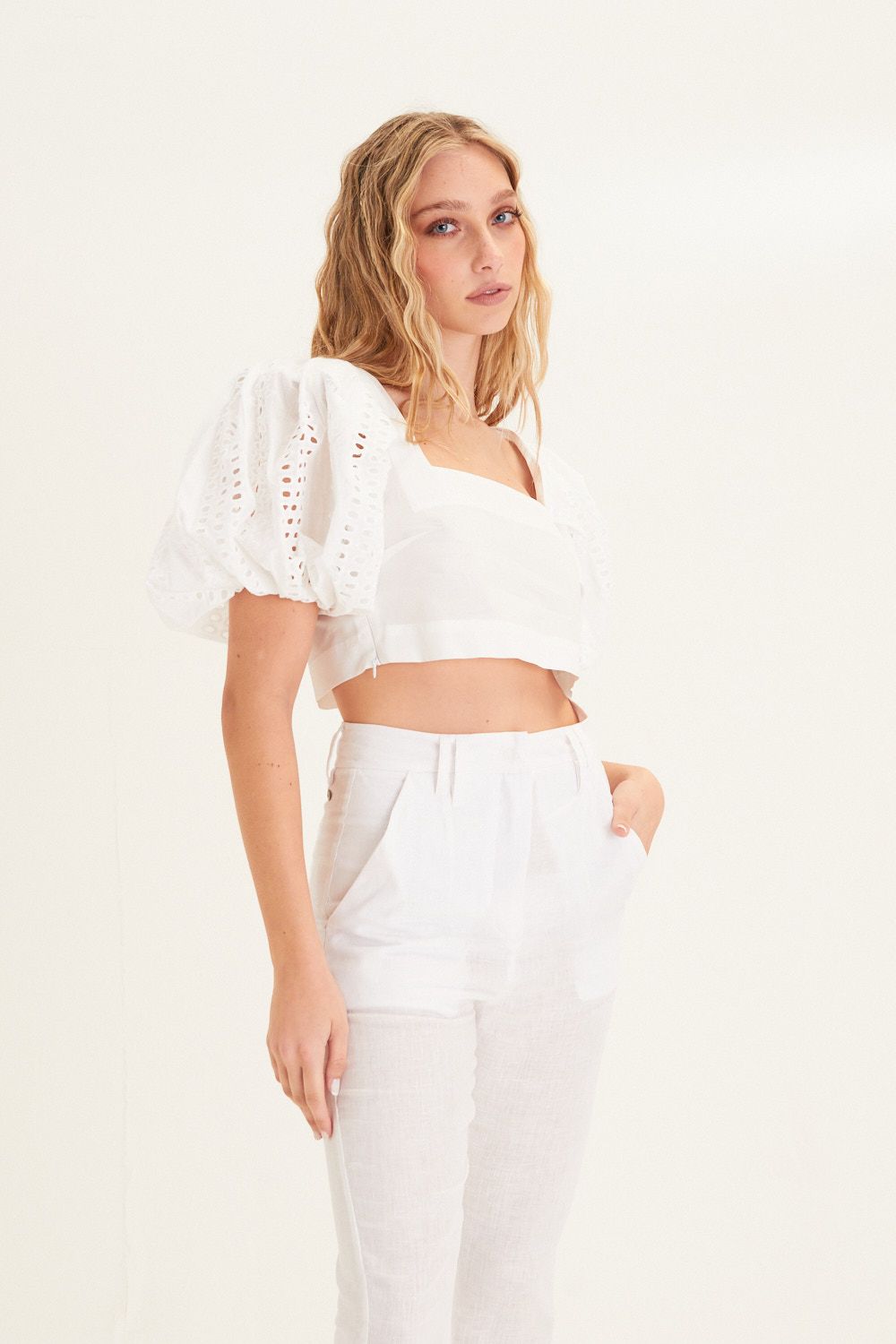 Top manga globo de broderie con lino en espalda.