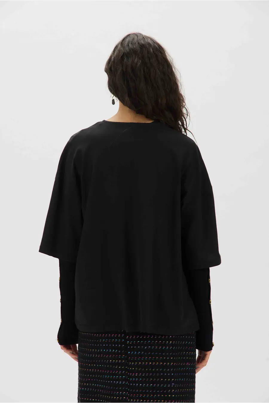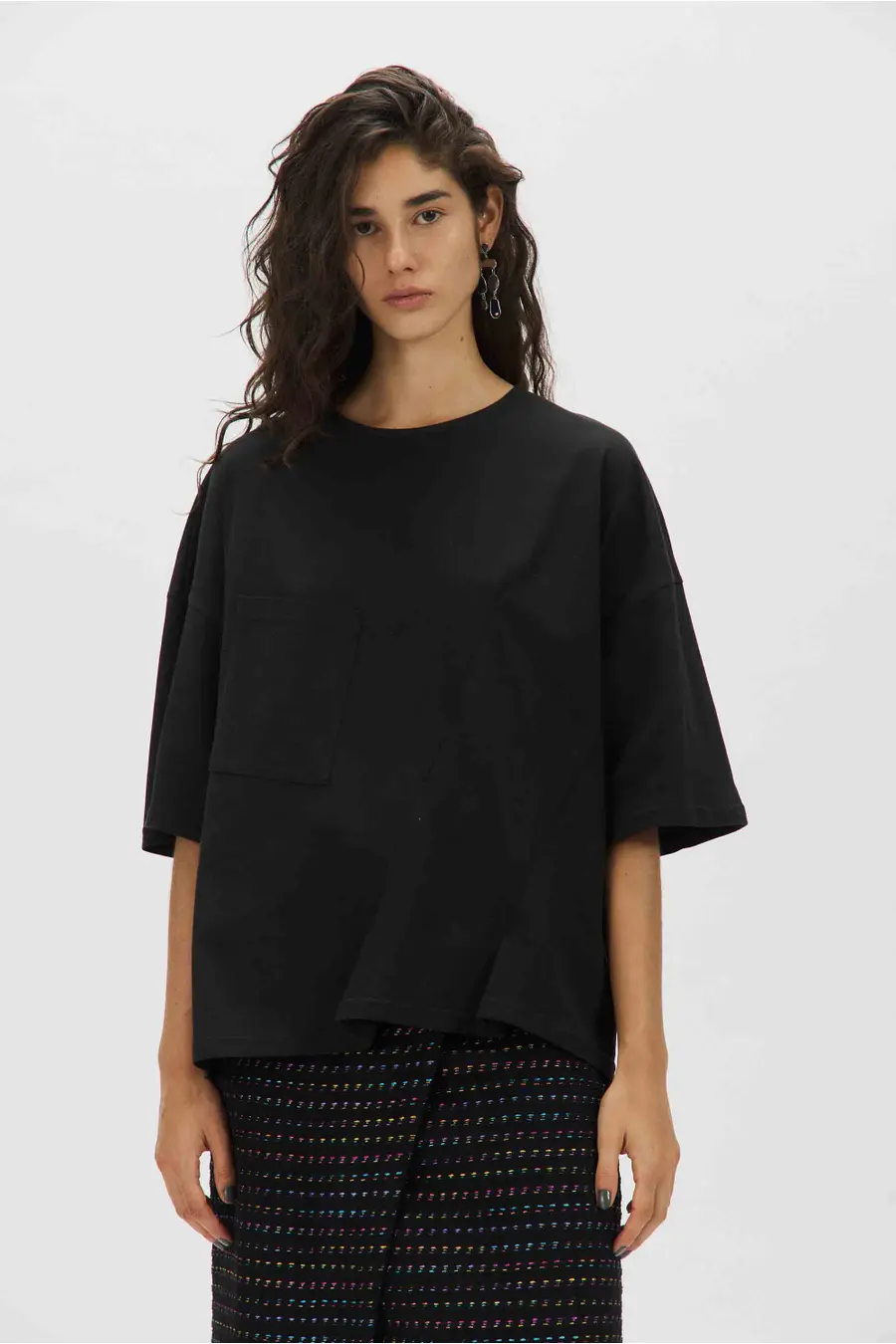 Remera de manga corta confeccionada en 100% algodón, con cuello redondo. Presenta varias pinzas diagonales que aportan un diseño único y distintivo. En el delantero, incluye un práctico bolsillo que suma funcionalidad y comodidad a la prenda. 100% Algodón.