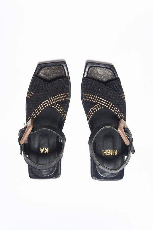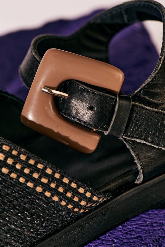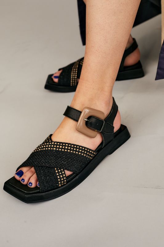 La sandalia Mykonos, es de punta cuadrada, con una capellada de tiras cruzadas en rafia con detalles de lúrex. Tiene pulsera al tobillo, en cuero vacuno, con hebilla de resina. La base de silueta geométrica es de eva de 2,5cm de altura.