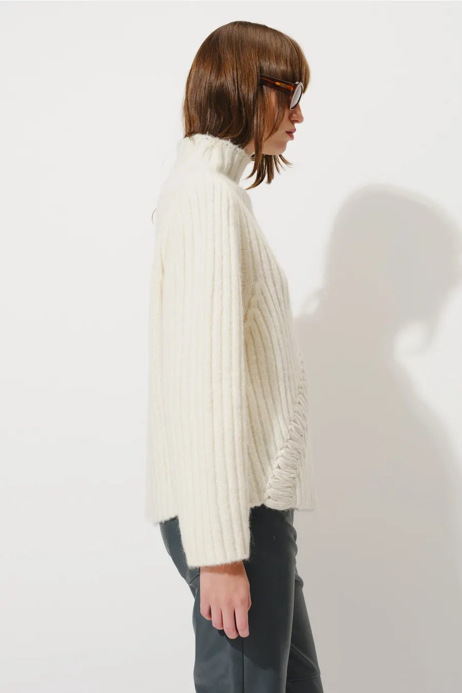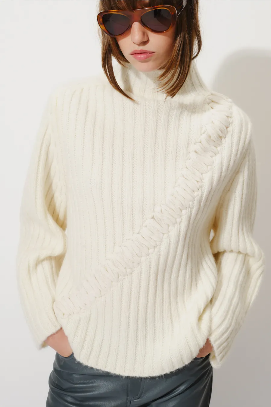 Sweater de punto confeccionada en tejido acanalado, de calce recto y manga larga. Presenta cuello alto que aporta abrigo y una silueta limpia. Como detalle distintivo, incorpora una aplicación textil en relieve que recorre el frente en forma diagonal, generando contraste de textura y color. El diseño combina sobriedad y carácter artesanal, ideal para looks de invierno con una impronta contemporánea y original. 42% Acrilico 30% nailon 20%lana 8%mohair.