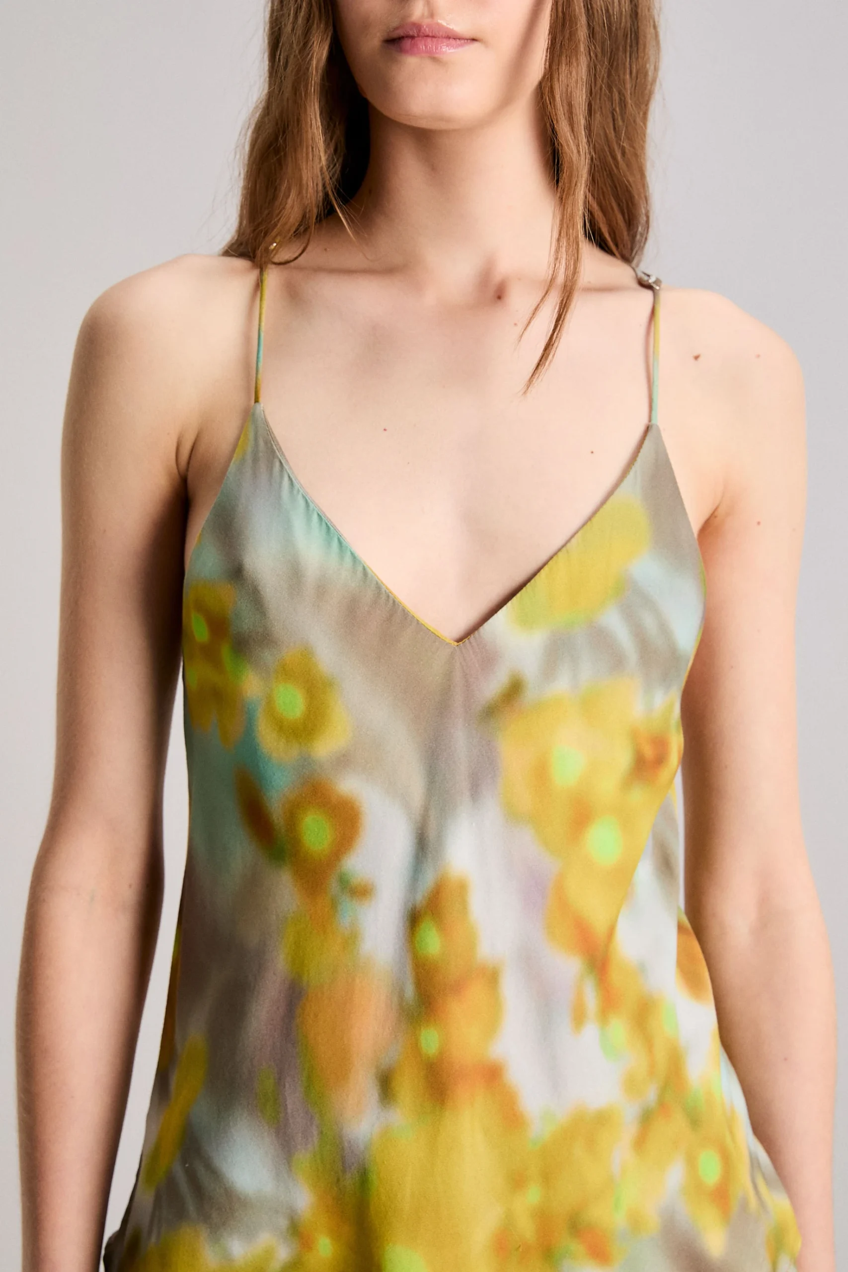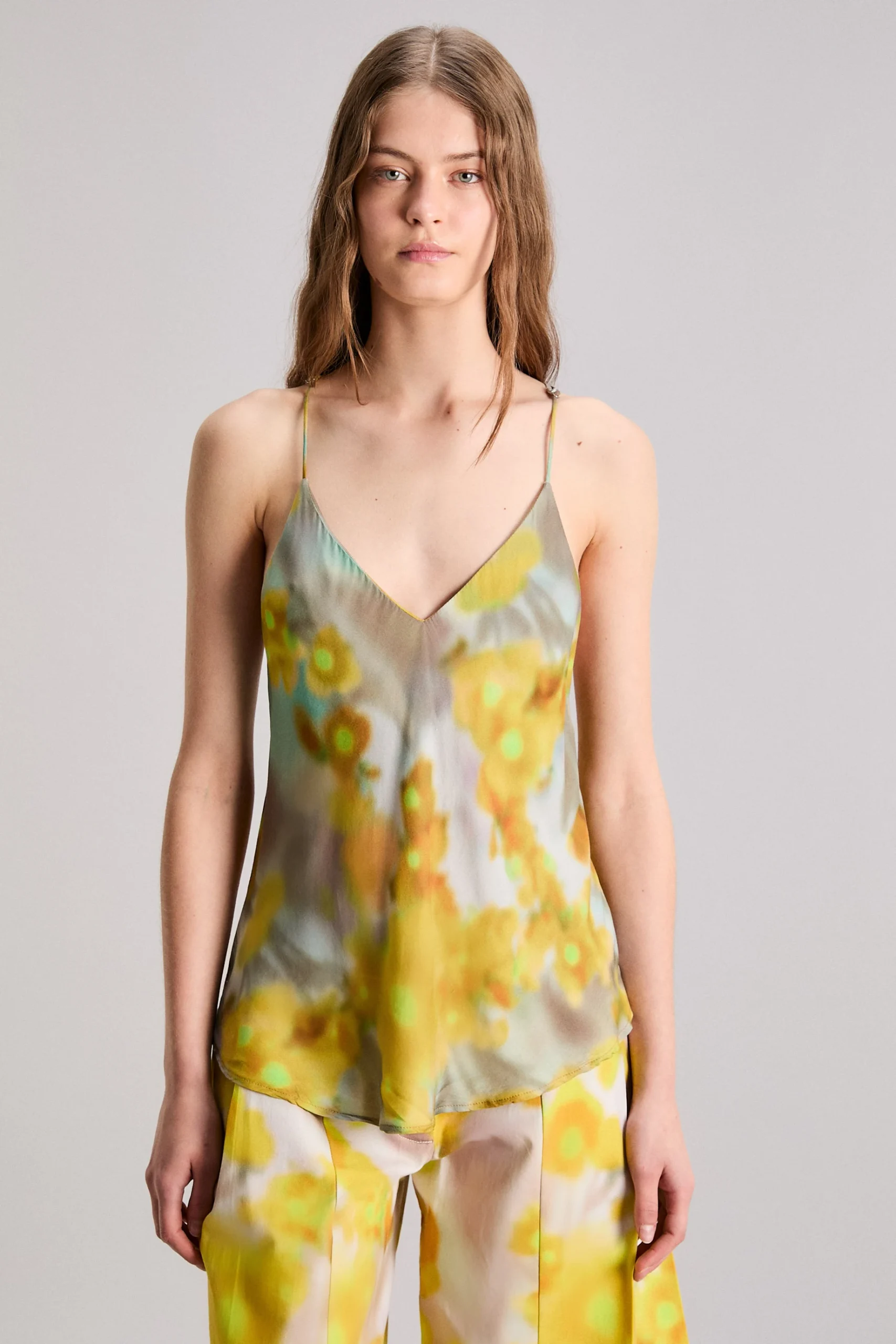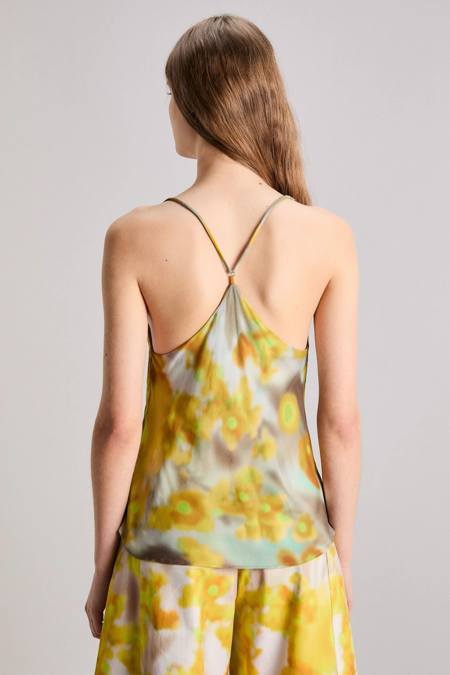 El top Daisy de calce regular y largo hasta la primera cadera, esta confeccionado en satén de viscosa, suave al tacto con estampa exclusiva de la colección. Tiene breteles cruzados y regulables.